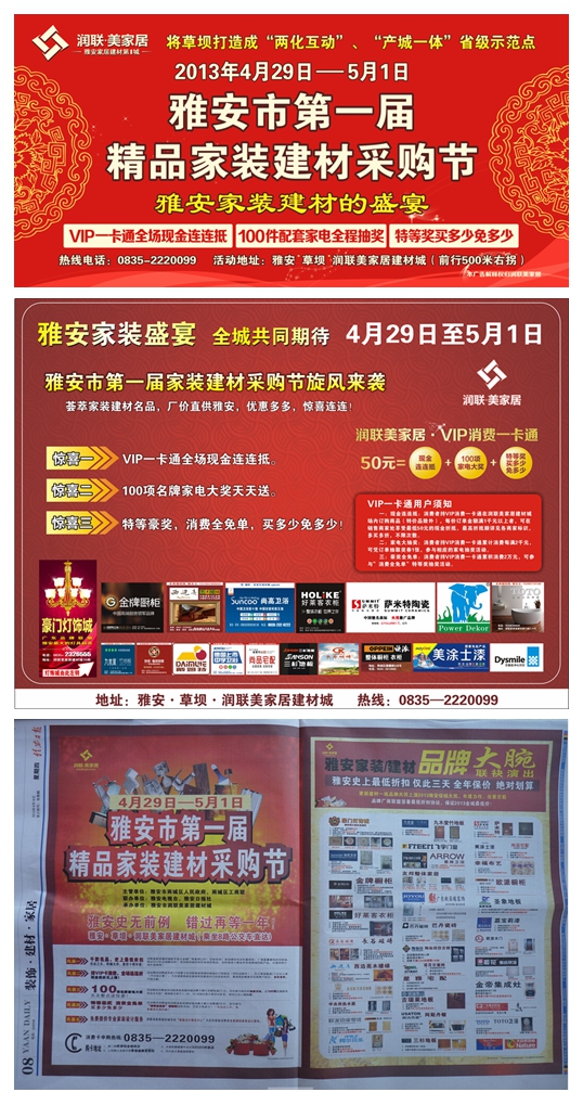 “雅安市第一屆精品建材采購(gòu)節(jié)”將于4月29日-5月1日在雅安草壩潤(rùn)聯(lián)美家居建材城舉辦,活動(dòng)集合政府、商城、商戶(hù)、社區(qū)等資源,為雅安引入新的購(gòu)物形式與購(gòu)物文化也為消費(fèi)者提供了實(shí)實(shí)在在的優(yōu)惠。